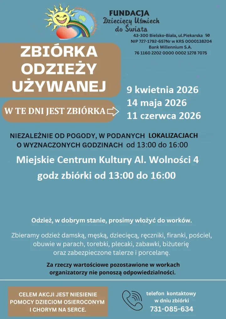 Akcja ma być prowadzona w różnych częściach Żywca, niezależnie od pogody, i będzie powtarzana raz w miesiącu aż do 11 czerwca. Za przedsięwzięciem stoi Fundacja Dziecięcy Uśmiech do Świata, która kieruje wsparcie do dzieci osieroconych oraz cierpiących na choroby serca. W dniu zbiórki dostępny ma być także kontakt telefoniczny do organizatora: 731 085 634.