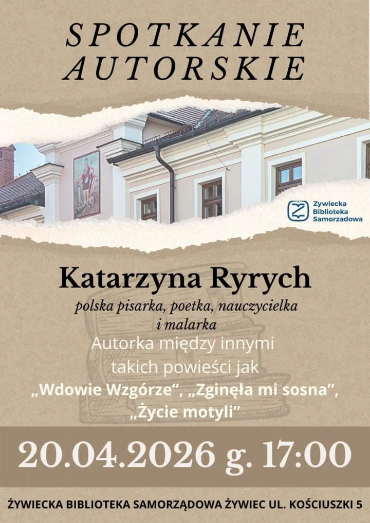W Żywieckiej Bibliotece Samorządowej zapowiada się spotkanie dla tych, którzy lubią literaturę blisko życia - z emocją, uważnością i bez zbędnego nadęcia. Już w poniedziałek 20 kwietnia o godz. 17.00 w Żywieckiej Bibliotece Samorządowej pojawi się Katarzyna Ryrych - pisarka, poetka, nauczycielka i malarka 📚✨
