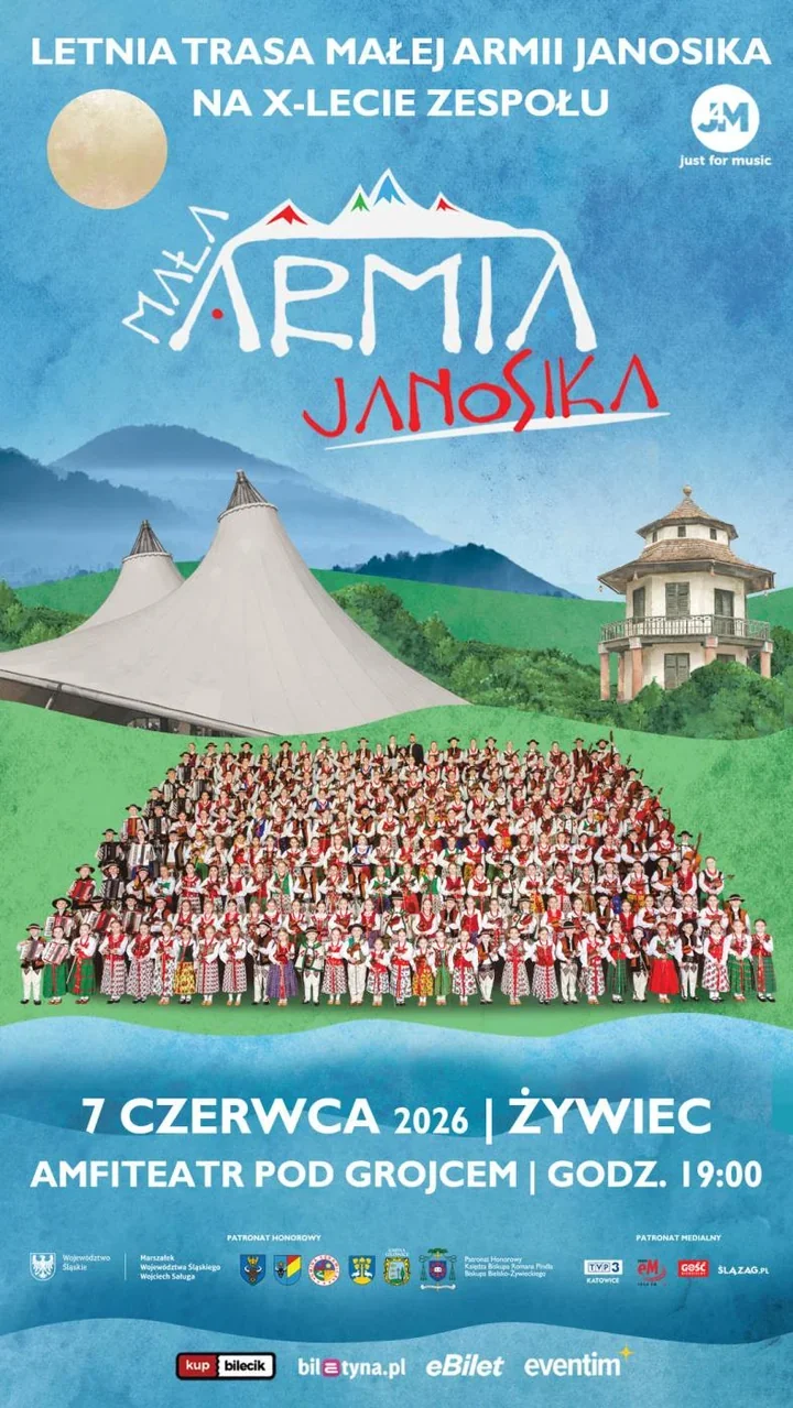 Na scenie pod Grojcem nie zabrzmi zwykły koncert, lecz widowisko z rozmachem, który rzadko trafia do amfiteatru. Mała Armia Janosika rusza w letnią trasę jubileuszową i jedzie przez największe sceny w kraju, łącząc góralską tradycję z repertuarem, który potrafi porwać także publiczność spoza folklorystycznego kręgu. Zespół świętuje 10 lat działalności, ale nie zamyka jubileuszu w jednym miejscu. W Żywcu zapowiada się wieczór, w którym setki głosów i instrumentów mają złożyć się na mocny, dźwięczny obraz Karpat.