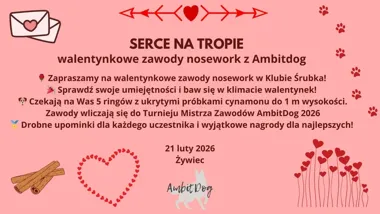 Niecodzienna, walentynkowa odsłona zawodów nosework w przytulnym, dekorowanym klimacie — idealne na spędzenie poranka z psem i dobrą zabawę. Wpadnijcie sprawdzić nosy swoich czworonogów i poczuć sportową rywalizację w lekkiej atmosferze – zapisy trwają, liczba miejsc ograniczona.