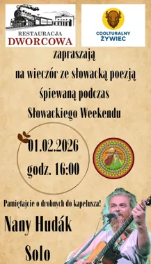 Restauracja Dworcowa tworzy kameralną przestrzeń, w której bliskość artysty i publiczności jest wyczuwalna — idealne warunki do wsłuchania się w słowa i melodię. Dopełnieniem będą serwowane dania słowackiej kuchni, które sprawią, że koncert stanie się pełniejszym doświadczeniem smaków i dźwięków.